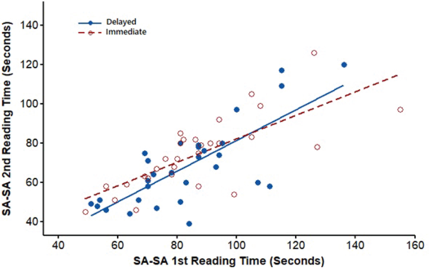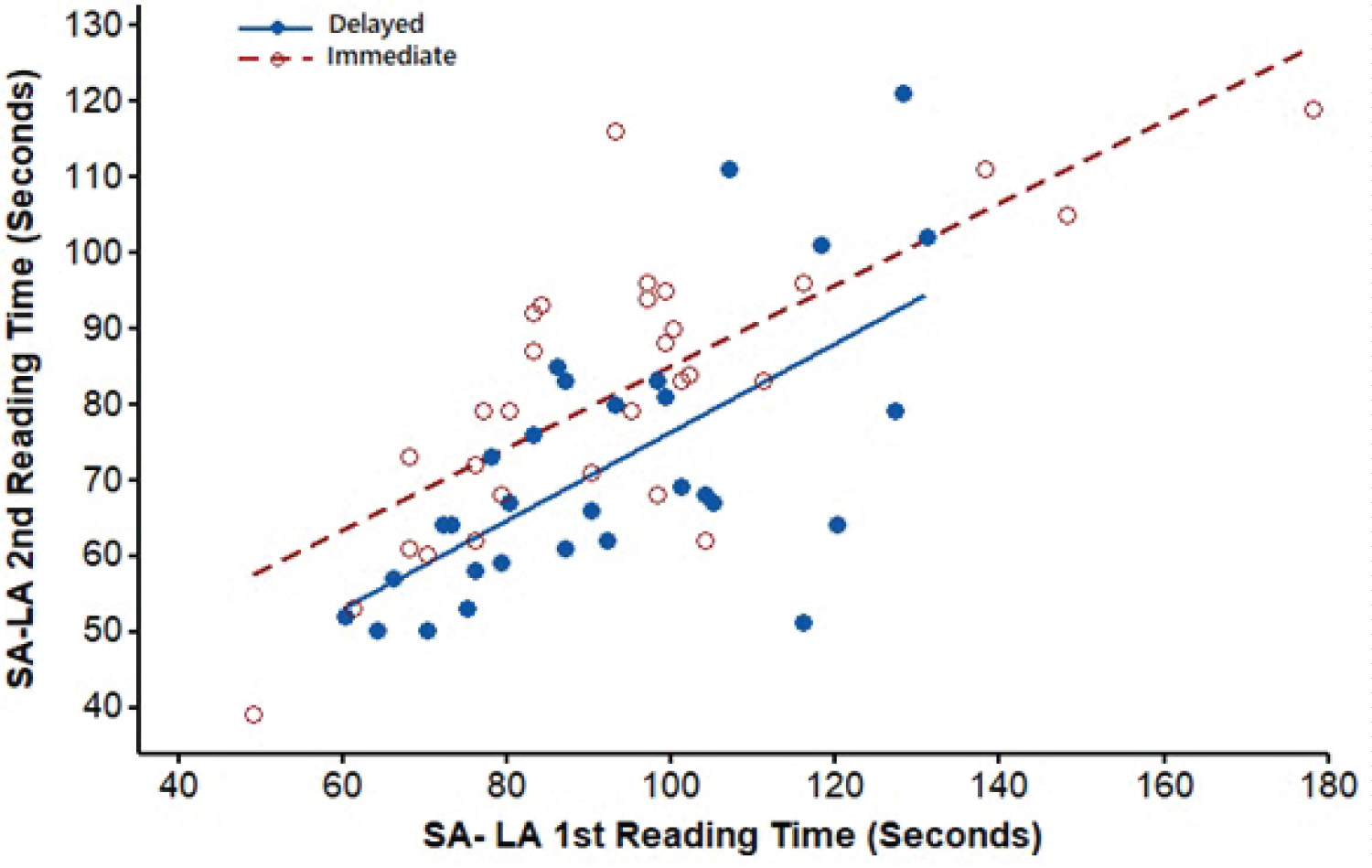 In line with our prediction that SA—which is not frequently practiced in the written form—will generate long reading times, the longest times were for SA texts under the SA-LA condition in the immediate and delayed groups. However, despite relatively long reading times, SA texts still provided meaning-based facilitation that survived the delay.