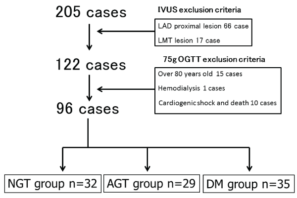 Patients aged >80 years (n=15), patients with cardiogenic shock, and cases of death (n=10) and hemodialysis (n=1) were also excluded from the study. The remaining 96 patients were divided on the basis of DM status (Figure 1).