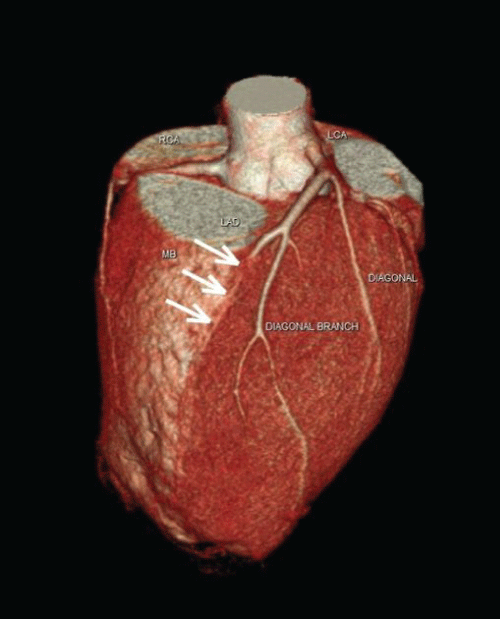 Multiple-slice computed tomography (MSCT) is an ideal technique because it enables visualization of the coronary artery lumens as well as the artery walls and the neighboring myocardium [12,13]. Stress single-photon emission computed tomography can detect reversible myocardial perfusion defects in patients with myocardial bridging and relate the amount of ischemia to the degree of systolic luminal narrowing [7].