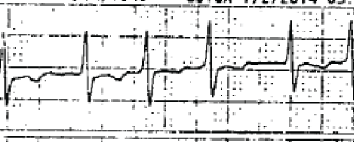 In the Emergency Department, a twelve-lead electrocardiogram was done and was consistent with atrial fibrillation with rapid ventricular response to 180 beats per minute (Figure 1). In the Emergency Department, he was started on heparin drip 12 units/kg/hr, received total diltiazem 40mg IV push and diltiazem 30mg PO, aspirin 325mg PO and metoprolol 25mg PO. However, his heart rate continued to remain in the 140s bpm, so the patient was admitted to medicine service/telemetry unit.