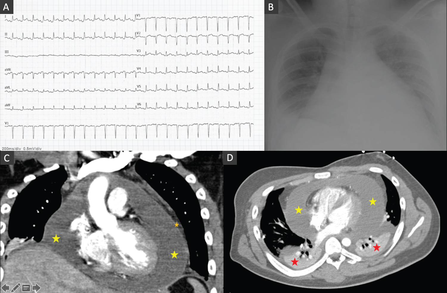 Figure 1: (A) ECG showing sinus rhythm, normal PQ interval, QRS with normal duration and elevation of the ST segment in leads V3-V6, aVL, LI and LII and ST segment depression in aVR; (B) Chest radiography showing severe cardiomegaly, bilateral pleural effusion with large right sided pleural effusion and parabronchial cuffing and perihilar haze; (C and D) Thorax-computed tomography confirmed a circumferential pericardial effusion (yellow star) with maximum dimension of 40 mm with a thick pericardium (orange star) and bilateral pleural effusion (red star) (with chest tube inserted in the right fifth intercostal space) in coronal (C) and axial (soft-tissue) view (D).