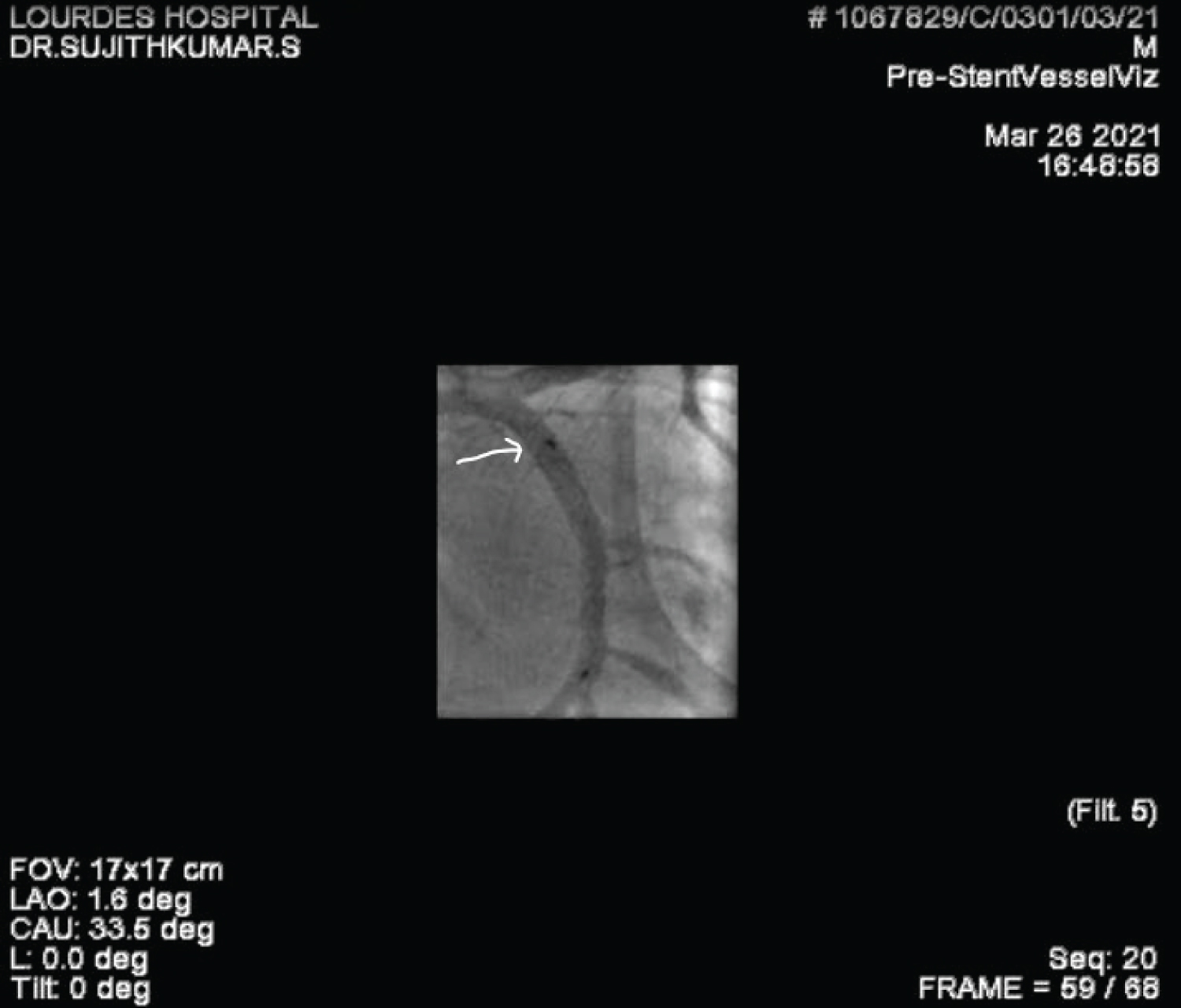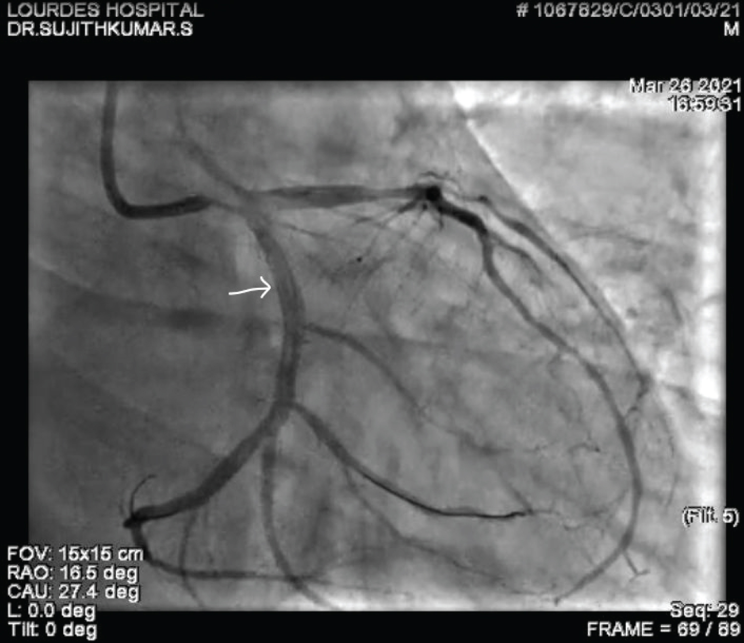 Figure 3: Coronary angiogram in PA caudal projection showing the initial deployed stent position (note position of stent in proximal LCX just after the tiny OM vessel shown by the white arrow).