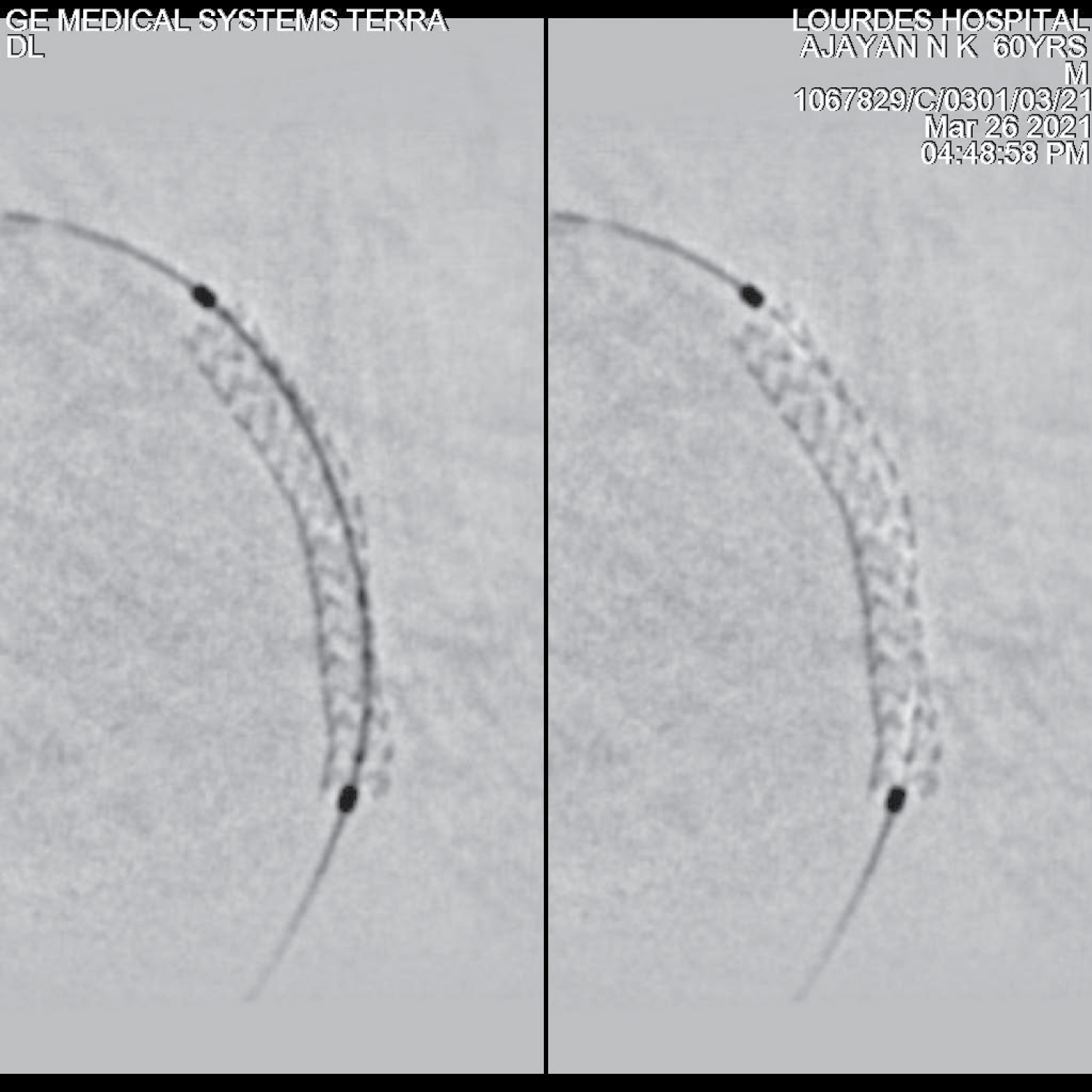 Longitudinal stent deformation (LSD) is a rare complication of angioplasty and stenting reported in about 1-1.5% of angioplasties [1-3]. The use of more and more complex devices and post-dilatation to ensure proper stent apposition leads to the increasing number of devices to track in and out of the deployed stent. This can lead to deformations of the deployed stent [1-3]. Longitudinal stent deformation is recognized as shortening of the stent with crowding of the struts of the stent on fluoroscopy or intravascular imaging. Most of the early studies have implicated Promus element stent as the stent platform associated with longitudinal stent deformation [1,4]. But others did not find any such association with the stent type and longitudinal stent deformation. Rhee, et al. did not find any relation between the types of stents they studied and the incidence of longitudinal stent deformation [2]. Recognition of the stent deformation is important as it can lead to stent thrombosis or restenosis [5,6]. We report a case of longitudinal stent deformation after implanting a Biomime sirolimus eluting stent. This is the first reported case of longitudinal stent deformation associated with Biomime stent.