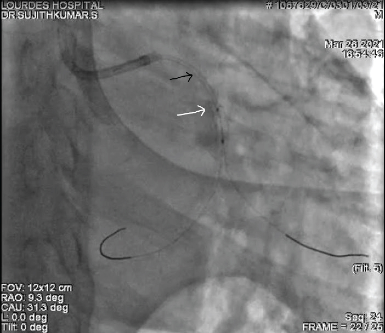 Figure 6: Coronary angiogram in RAO Caudal projection after the rewiring of OM and the passage of post dilatation balloon into the stent (the black arrow denotes the initial position of the stent and the white arrow shows the deformed and displaced proximal end of stent).