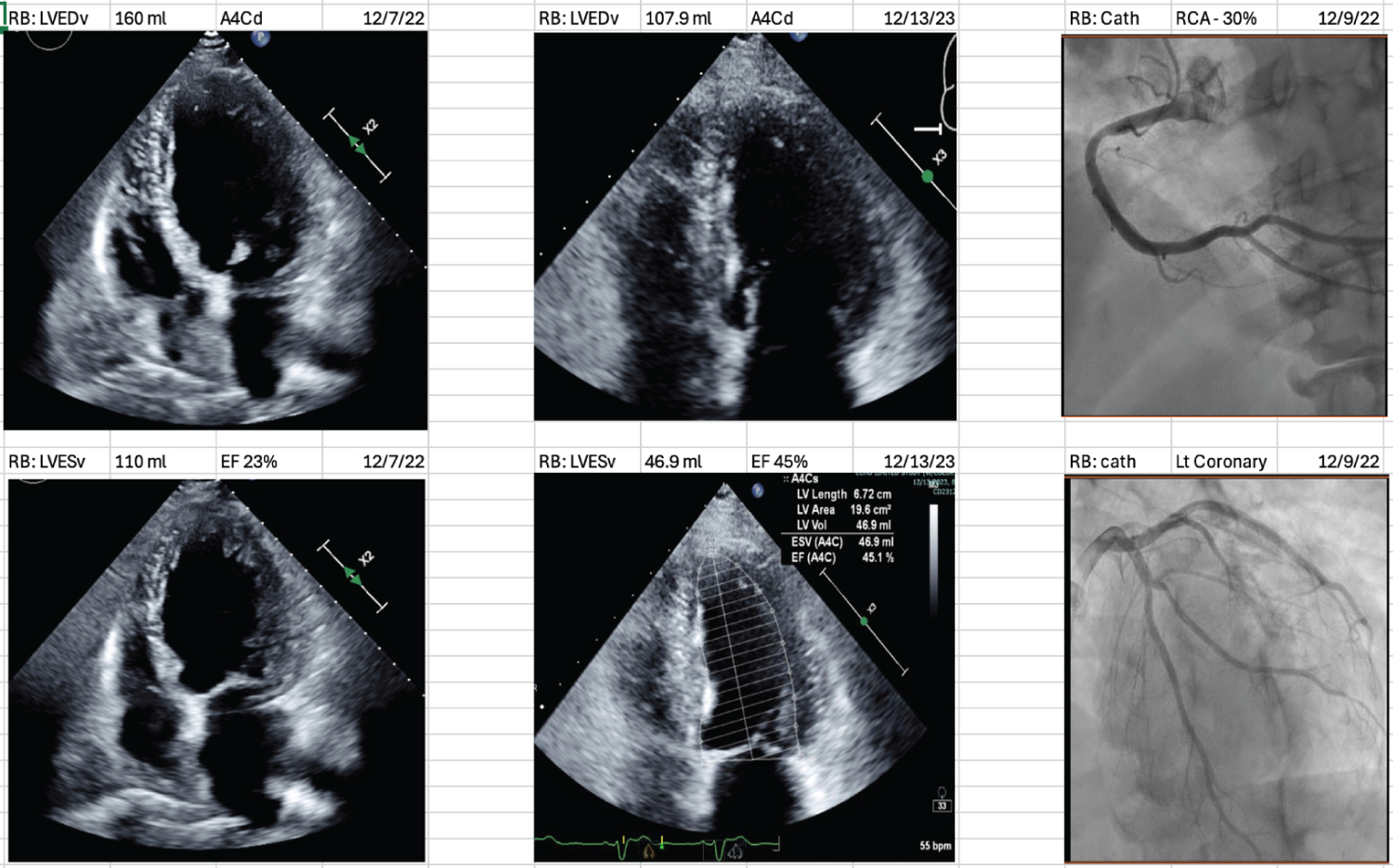 Echocardiograms: Left panel- upper as baseline (before treatment) LVED volume in diastole and the left lower as LVED volume in systole; Middle panel- upper as final (after treatment) LVED volume in diastole and the lower middle in systole (apical 4C views).