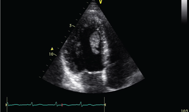 A 48 years old male patient was referred to our clinic for intraventricular mass, detected incidentally during non-cardiac preoperative evaluation. The medical history of the patient was unremarkable except suspicious history of heart attack four years ago. Physical examination was normal. ECG showed normal sinus rhythm 76 beats per minute.