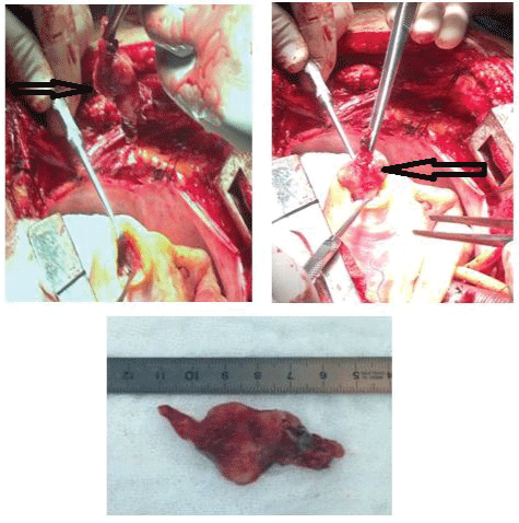 Echocardiographic examination (Figure 1) revealed isodense mobile mass attached to left ventricle apex, moving in every systole towards the left ventricle outflow tract. Left ventricular segmental wall motion abnormalities weren't detected by echocardiography. Blood analysis were performed to determine any diseases predisposing to thrombosis formation (antithrombin III, activated protein C resistance, Protein C and Protein S, Lupus anticoagulants, rheumatologic markers, erythrocyte sedimentation rate, full blood count including eosinophil count) and imaging studies were performed to rule out malignancies, but nothing could be found. Surgical excision of this mobile mass was planned because of high risk of embolization. Preoperative coronary angiography revealed chronic dissection and severe stenosis at right coronary artery with TIMI 3 distal flow. Surgical excision of the mass (Figure 2) was performed without any complication, and the patient was discharged with antiplatelet and oral anticoagulation treatment.