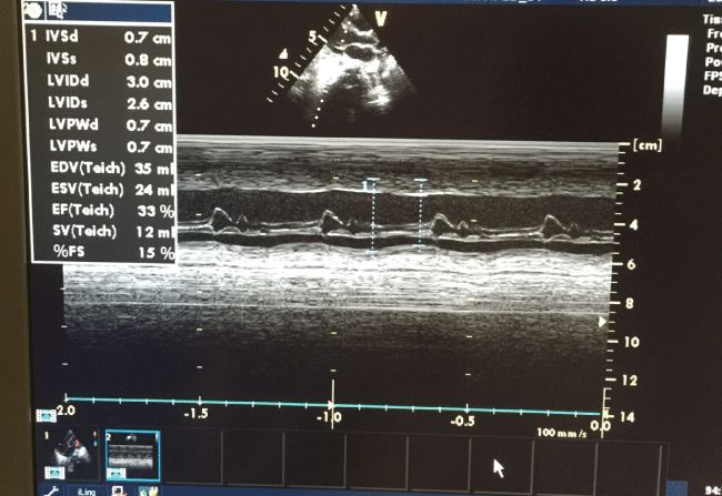 ECG showed low voltage. Besides, an echocardiogram (ECHO) noted severe ventricular dysfunction with FS 15%, and poor contractility (Figure 1a), which were improved on follow up.