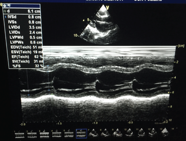 Initial ECHO showed severe left ventricular dysfunction with poor contractility, with dilated right ventricle, myocarditis, moderate mitral and tricuspid regurge, FS 14% (Figure 2a). Three weeks later, Myocarditis was improved with normal heart function. FS 38%. Six months follow up showed normal left ventricle function, no mitral regurge, FS 32%, EF 63% (Figure 2b).