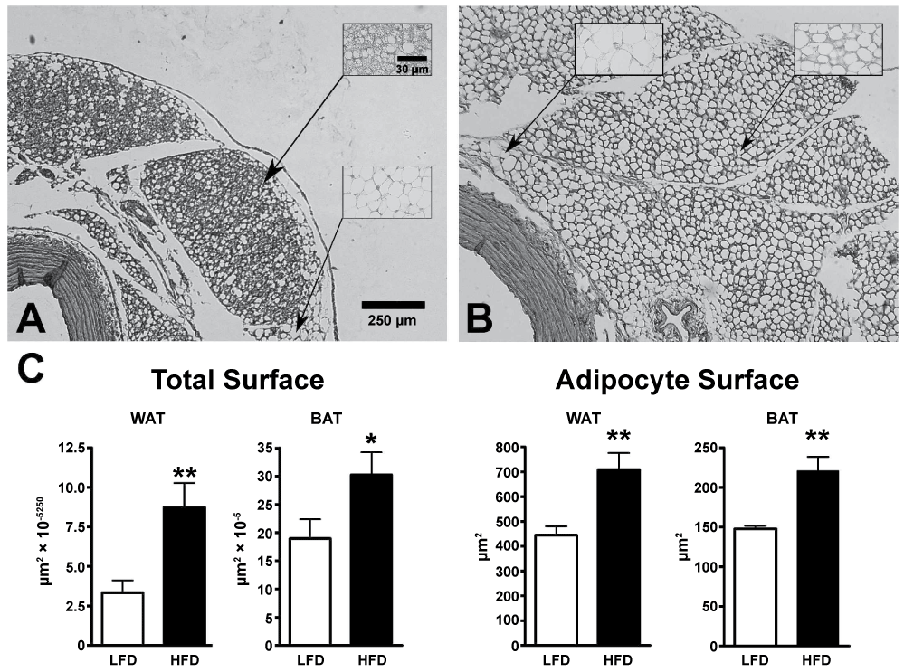 Figure 1: A,B) Photomicrographs of the aortic wall and the Perivascular Adipose Tissue (PVAT) obtained from Low-Fat (LFD) or High-Fat Diet (HFD) fed rats. Paraffin sections were counterstained with haematoxylin and eosin. Aortas from LFD-fed animals were surrounded by a thin layer of PVAT, mostly composed of BAT (Figure 1A) in which lipid droplets were small (Figure 1A, upper inset; the lipid droplets were depleted during paraffin embedding and therefore appear as an empty space). Only few areas of WAT were observed (Figure 1A, lower inset). Sections obtained from HFD-fed rats showed a thicker PVAT layer (Figure 1B) with enlarged brown (Figure 1B, right inset), and white (Figure 1B, left inset) adipocytes; C: White and brown adipocytes total areas and individual surfaces were measured in counterstained paraffin sections as described in Material and Methods section. Results are expressed as mean ± SE (n = 10/group for aortic wall thickness, overall WAT and BAT total areas and WAT adipocytes area, n = 6/group for BAT adipocytes surfaces WAT: White Adipose Tissue; BAT: Brown Adipose Tissue). View Figure 1