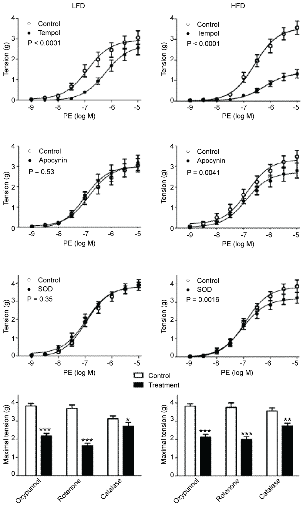 In rings without PVAT, preincubation with tempol, a ROS scavenging reagent, decreased the response to PE, this effect being more important in HFD-fed rats compared with LFD-fed animals (-59% and -24%, respectively). Preincubation with apocynin, a NADPH oxidase inhibitor, was without effect in rings obtained from LFD-fed rats and reduced the contraction to PE in rings obtained from HFD-fed animals. Preincubation with SOD was devoid of effect in LFD rings rats, whereas it decreased the contraction to PE in HFD rings. Taken together, the above-mentioned observations demonstrate that the increased procontractile activity found in HFD rings was, at least in part, generated by NADPH oxidase through O2-. The contractile response to PE was attenuated by oxypurinol, a xanthine oxidase inhibitor, or rotenone, a cytochrome c oxidase inhibitor, in both groups (-40 and -54% in LFD, and -40 and -44% in HFD). Catalase markedly attenuated the contractile response to PE, to the same extent in rings obtained from LFD- or HFD-fed rats (-25% in LFD and -17% in HFD). These findings indicate that aortic wall xanthine oxidase and cytochrome c oxidase have procontractile properties, mediated by H2O2.
