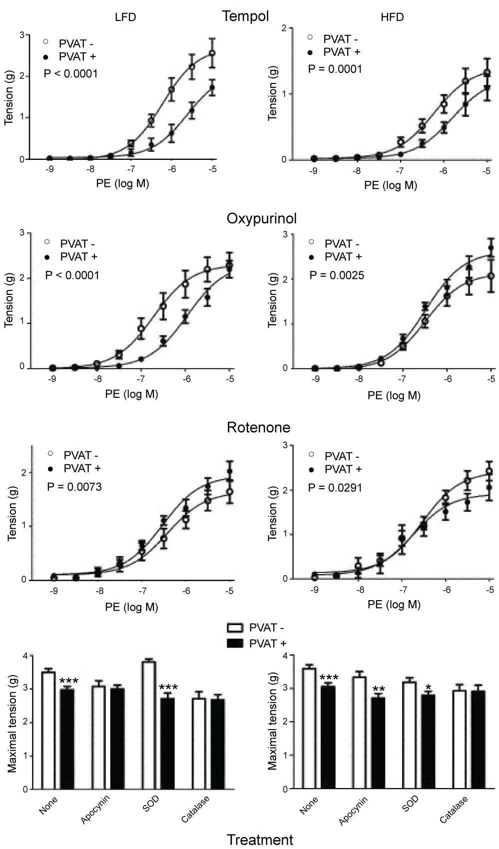 The presence of PVAT and the diet modified the effect of the various drugs tested. We found that, in LFD rats, the prorelaxant properties of PVAT were increased after preincubation with tempol, demonstrating that, under our experimental conditions, PVAT has a ROS-mediated procontractile activity. The response to PE after preincubation with tempol in rings with PVAT compared to rings without PVAT was reduced in HFD-fed rats compared with LFD-fed animals (-10% and -26%, respectively). Preincubation with apocynin supressed the anticontractile properties of PVAT in rings obtained from LFD-fed rats whereas it was devoid of effect in rings obtained from HFD-fed animals. Incubation with oxypurinol amplified the anticontractile effect of PVAT in LFD animals while it reversed this effect in HFD rats. This suggests that O2-. generated by PVAT xanthine oxidase acts as procontractile ROS in LFD animals while, after dismutation to H2O2, it shifts to anticontractile in HFD animals. In rings obtained from LFD animals, incubation with rotenone reversed the anticontractile effect of PVAT whereas it was devoid of effect in HFD rats. Such data indicates that PVAT cytochrome c oxidase is anticontractile in LFD rats whereas it is no longer active in HFD animals. Incubation with SOD increased the anticontractile effect of PVAT in LFD rats whereas it was devoid of effect in HFD animals. Catalase-induced H2O2 removal suppressed the effect of PVAT in both groups. The above-mentioned observations are consistent with a H2O2-mediated anticontractile mechanism.