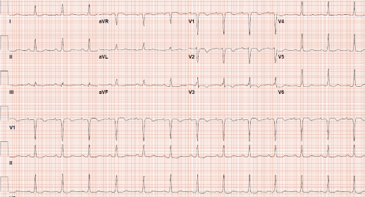Serial troponin I levels (ng/L) measured were less than 16 ng/L (lab reference 0-45 ng/L). All laboratory data including the electrolytes and D-dimer were within normal limits. She had a cardiac catheterization two months ago for chest pain and shortness of breath which showed no coronary artery disease. A transthoracic echocardiogram revealed normal ejection fraction with no wall motion abnormalities. An X-ray of left shoulder joint showed degenerative osteoarthritis and with intraarticular steroid injection her pain significantly improved. A repeat ECG (Figure 3) obtained on the next day showed complete resolution of the anterior T wave inversions and resumption of left bundle branch block. In our patient the T wave inversions were consistent with the diagnosis of cardiac memory due to intermittent left bundle branch block.