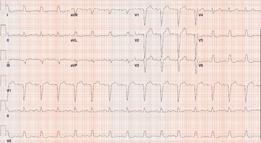Figure 3: ECG obtained on day 2 showing resumption of left bundle branch block and resolution T wave inversions in leads V1-V3. View Figure 3