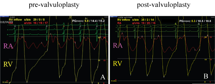 Figure 2: A) Cardiac catheterization revealed 9.8 mmHg of mean transvalvular pressure gradient and mean right atrial pressure that had elevated to 17 mmHg. The tricuspid valve area was measured as 1.0 cm2 by Gorlin's equation; B) After the procedure, mean transvalvular pressure gradient decreased to 5.3 mmHg, mean right atrial pressure was then reduced to 15 mmHg and the tricuspid valve area increased to 1.3 cm2.
