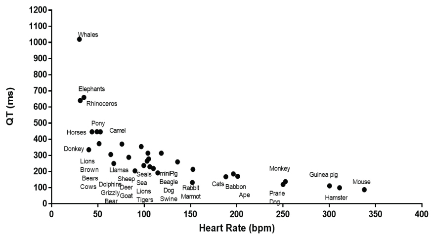 The literature on the QT and heart rate of 32 different species was examined specifically in the whales, dolphins, Asian elephants, rhinoceros, camels, brown bears, grizzly bear, lions, tigers, sea lions, seals, donkeys, ponies, horses, cows, sheep, goats, llamas & alpacas, swine, Minipigs, deer, dogs, cats, baboons, apes, monkeys, prairie dogs, marmot, rabbit, hamsters, guinea pigs and mice.