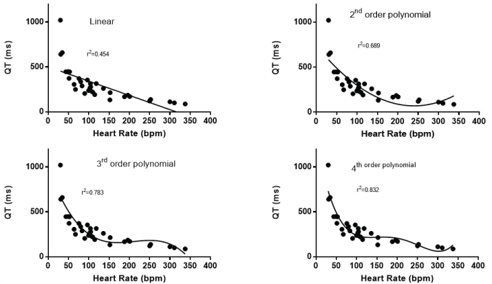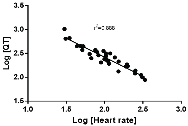 The QT-heart rate relationship was examined by several models considering linear or polynomial relationships. Log transformation and a nonlinear fit of the data were also applied. The least squares estimate of the relationship was calculated and the correlation (r2) was reported.