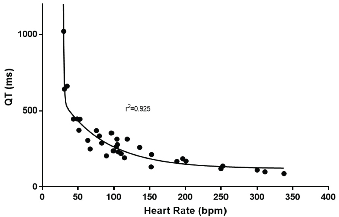 This study has important implications for cardiologic assessment in humans. The Bazett [7] and the Fridericia formulae [8] for heart rate correction of the QT interval are in wide spread usage in clinical medicine. This study found that both formulae were inadequate to describe the QT-heart rate relationship across species. Support for these findings can be found in other reports [65,66]. Linear models have been advanced to better describe the QT-heart rate relationship [67,68]. A linear model did not fit the cross-sectional animal data. While polynomial models were better, they were not optimal. A true nonlinear two phase (decay) equation fit the data best). These data suggest that slow heart rates need one adjustment for heart rate and faster heart rates require another adjustment. This finding supports the use of a spline function which can adjust for the slow and fast heart rates differently [66].