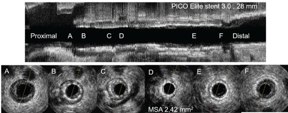 IVUS images were analyzed at 6 locations: Proximal and distal reference segment within 3 mm beyond the stent edge, proximal and distal segment of stent, the site of the narrowest neo-intimal lumen (minimal lumen area, MLA), and the site of the narrowest stent area (minimal stent area, MSA), respectively. Proximal and distal reference segments were the most normal looking cross sections within 3 mm beyond the stent edge, and proximal and distal segment of stent were most normal looking cross sections of proximal and distal half of stent, respectively.