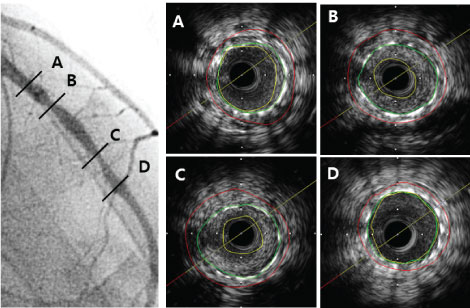 Qualitative analysis was performed blind to clinical data according to the criteria of the American College of Cardiology clinical expert consensus document on IVUS. Using the planimetry software (TapeMeasure®, INDEC Systems, Mountain View, California), we measured external elastic membrane (EEM) CSA (cross sectional area)(mm2), lumen CSA (mm2) and stent area (SA, mm2). Plaque burden, defined as plaque and media (P&M) CSA, was calculated as EEM CSA minus lumen CSA [EEM CSA- lumen CSA, (mm2)]. Percent plaque burden was calculated as P&M CSA divided by EEM CSA [(EEM CSA-lumen CSA)/ EEM CSA x 100, (%)].