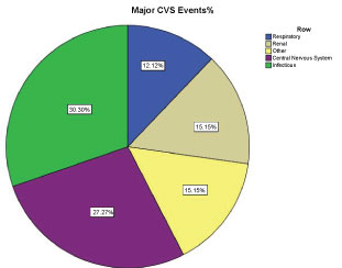 Table 6 illustrates the different major CVS event and their time-course. Most major CVS events were deaths (13.7%) followed by Ischemic stroke (4.6%) (Figure 3).