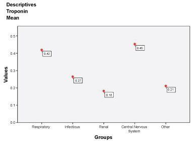 Among the 131 patients included in this study, the most common etiology associated with elevated Cardiac troponin was the infectious group, with UTI being the most common diagnosis. Sepsis is the leading cause of death in the non-cardiologic ICU. Poorly distributed nutritive blood flow and altered convective and diffusive oxygen transport during sepsis can lead to organ dysfunction and multiple organ failure. One of the causes of myocardial dysfunction is thought to be myocardial ischemia in sepsis; however, conventional biochemical parameters to detect myocardial ischemia lack sensitivity and specificity. Serum cardiac troponin T (S-TnT) was reported to have higher sensitivity and specificity in diagnosing minor myocardial injury [36-43].