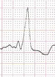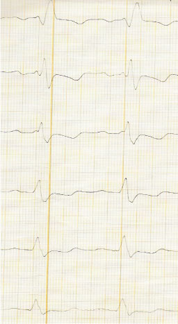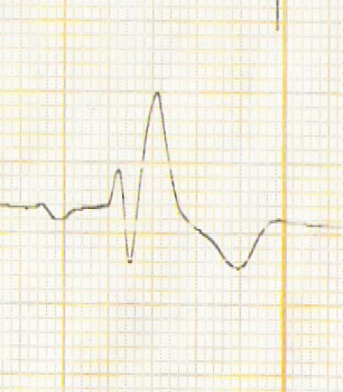 Figure 1: Atypical low voltage complete right bundle branch block in lead V1.