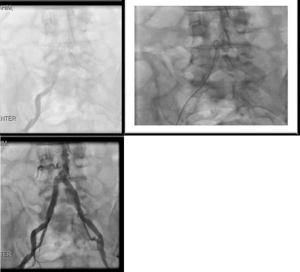 Figure 2: Showing bilateral iliac calcific occlusion (pre) and post Iliac Artery Stents Bilaterally.