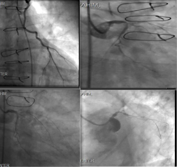 Then we proceeded with diagnostic coronary and graft angiography which showed occlusion of native vessel LAD, RCA, subtotal distal left main (LMN) and ostial left circumflex (LCX) as well as occluded SVG to OM & occluded SVG to RCA, he had patent LIMA to LAD supplying Collateral to posterior descending artery, moderate left Subclavian artery 40%-50% disease (Figures 3). So ad hoc PCI was done to distal LMN into LCX angioplasty and stenting using drug eluting stent (DES) 3.5 × 18 mm with excellent result and TIMI III flow and with improved collateral flow to distal RCA posterior and lateral ventricle circulation (Figures 3).
