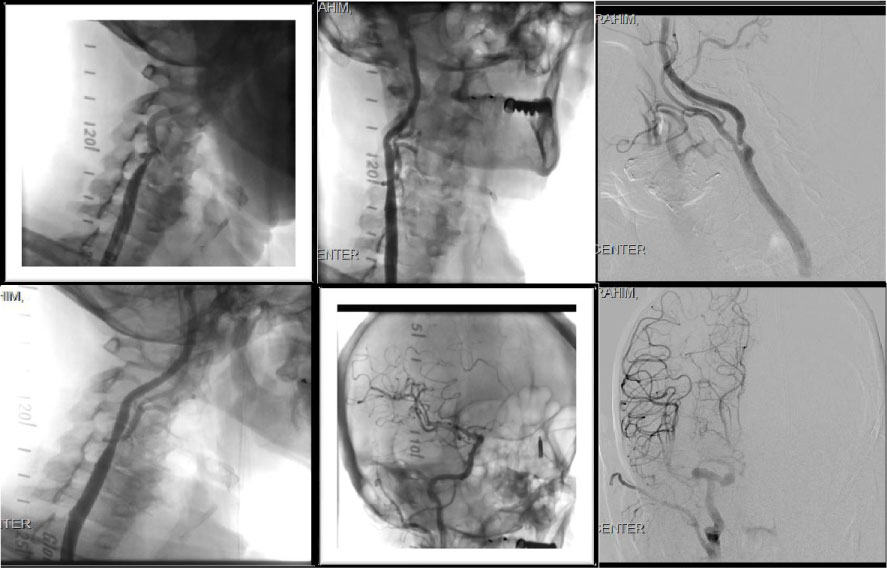 On the same setting Carotid Angiogram showed significant > 80% right ICA, with left carotid artery 60% stenosis. We proceeded with intervention also in the same setting, Successful right internal carotid artery angioplasty and stenting using 6 × 8 × 30 mm XACT self-expandable stent with Emboshield NAV 6 distal protection filter device, achieving excellent angiographic result with improved right cerebral perfusion on post stent angiogram (Figures 4).