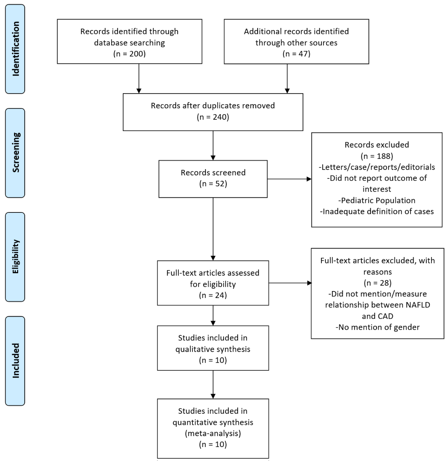 The process of study selection is presented in Figure 1. Our initial literature search yielded 247 potential studies for review. Following exclusion of review articles, case reports, retrospective studies, abstracts, studies with insufficient data, and articles with overlapping study populations and redundant data, a total of 10 studies were included in the final analysis (Table 1). All studies were conducted in the USA, Europe, Japan, Saudi Arabia, South Korea, and China. 8 studies reported incidence, 4 of which were retrospective and 4 were prospective. 2 studies were cross-sectional studies that reported prevalence. The number of patients in each study varied with over 80,000 patients in the largest study and 268 patients in the smallest study. Among 259,598 patients with NAFLD, 44% were females and 56% were males, with a weighted mean age of 50 years.