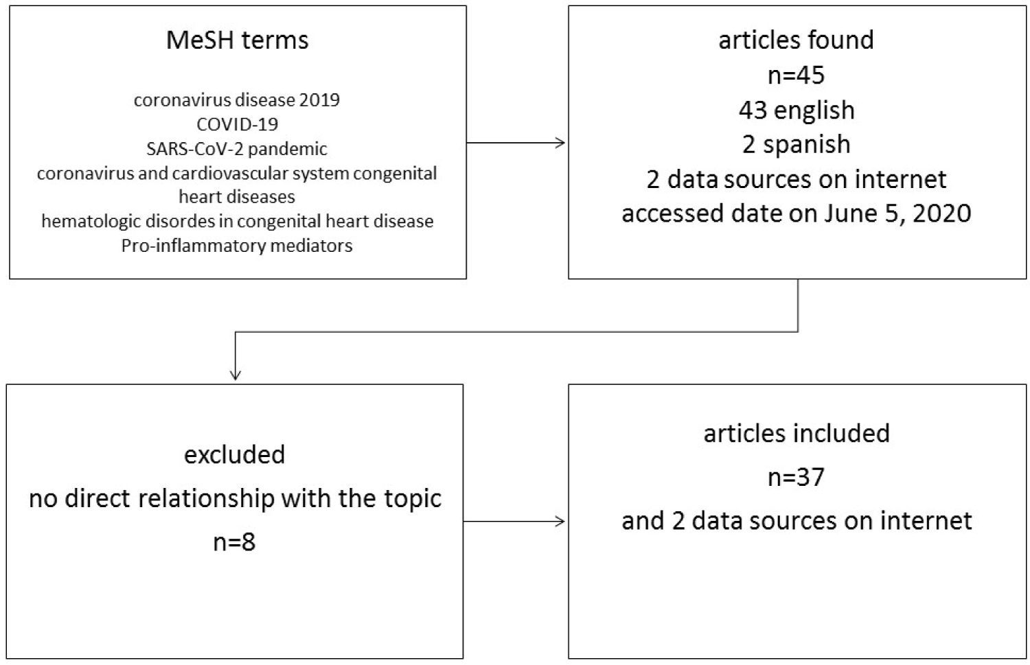 A narrative and analytical review was conducted to answer the question of which CHD risk factors could increase vulnerability to the coronavirus infection. A search of the PubMed, Science Direct, SciELO, MD Consult and Google Scholar databases was performed, using the MeSH terms "coronavirus disease 2019", "COVID-19", "SARS-CoV-2 pandemic", "coronavirus and cardiovascular system", "congenital heart diseases", "hematologic disorders in congenital heart disease", and "pro-inflammatory mediators". Altogether, 43 articles in English and 2 in Spanish were included, along with two internet data sources (accessed on June 5, 2020). Articles containing related information were selected. Eligible articles were screened and the titles and abstracts of all the articles found were reviewed. Eight were discarded because they had no direct relationship to the topic. In the end, 39 articles were included as the most relevant (Figure 1).