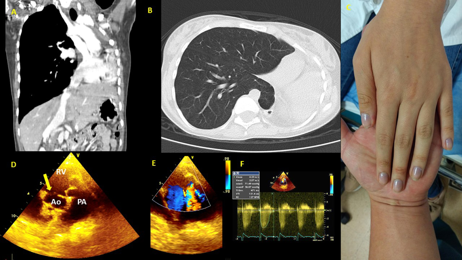 Figure 3: 16-year-old female with severe unrepaired CHD, multiple risk factors at the same time. (A) CT (Computed Tomography) thorax: Left lung agenesis, and important scoliosis; (B) CT thorax: Right lung hyperinflation compensatory, and herniation to left hemithorax; (C) Left hand showing marked central hypoxemia due to unrepaired severe CHD, saturation 75% on room air; (D) Echocardiography study: Short axis view shows double-outlet RV. Yellow arrow shows relationship between the VSD and the blood vessels; (E) The same view in D, doppler color shows pulmonary valve stenosis; (F) Doppler in pulmonary valve with 71 mmHg peak gradient.