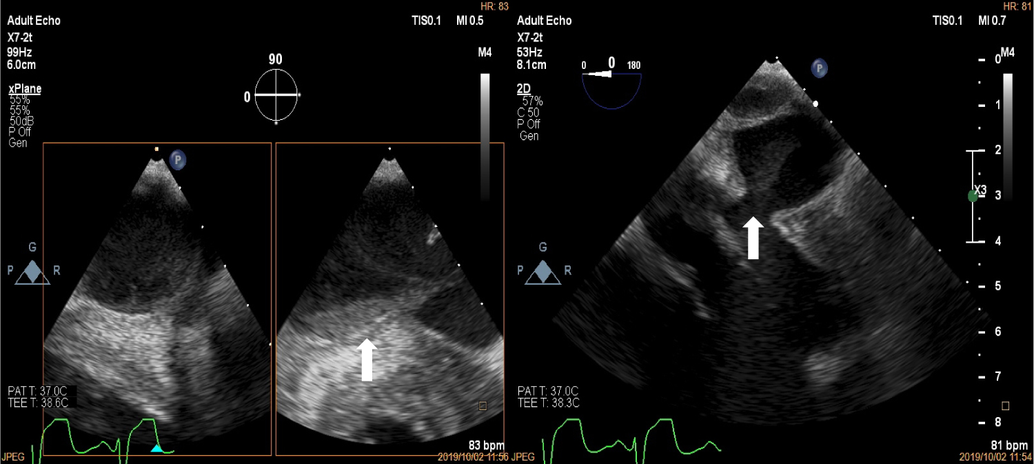 Figure 2: Trans-oesophageal echocardiogram at the mid-oesophageal position showing spontaneous echo contrast and thrombus formation in the sub-mitral aneurysm (white arrows).