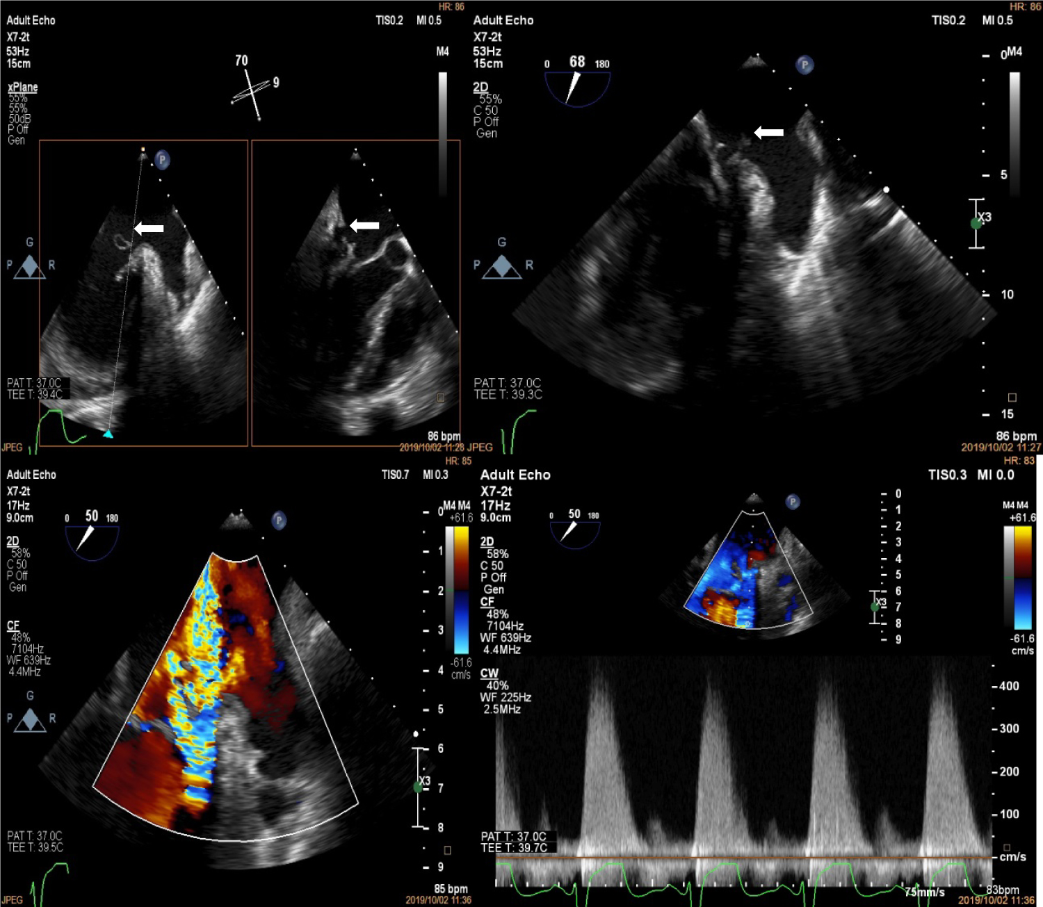 Figure 3: Trans-oesophageal echocardiogram at the mid-oesophageal level showing perforation of the P1 segment of the posterior mitral leaflet (top left, white arrows) with possible vegetation (top right, white arrows). The bottom panels show the severe mitral regurgitation jets on colour (left) and continuous wave Doppler (right).