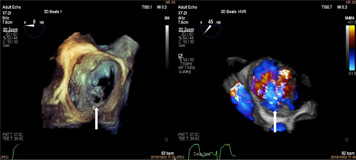 Figure 4: Three-Dimensional Transoesophageal echocardiogram showing "enface view" of the mitral valve with perforation in the P1 segment of the mitral valve (left, white arrow) and three dimensional colour showing mitral regurgitation jet through posterior mitral leaflet perforation (right, white arrow).