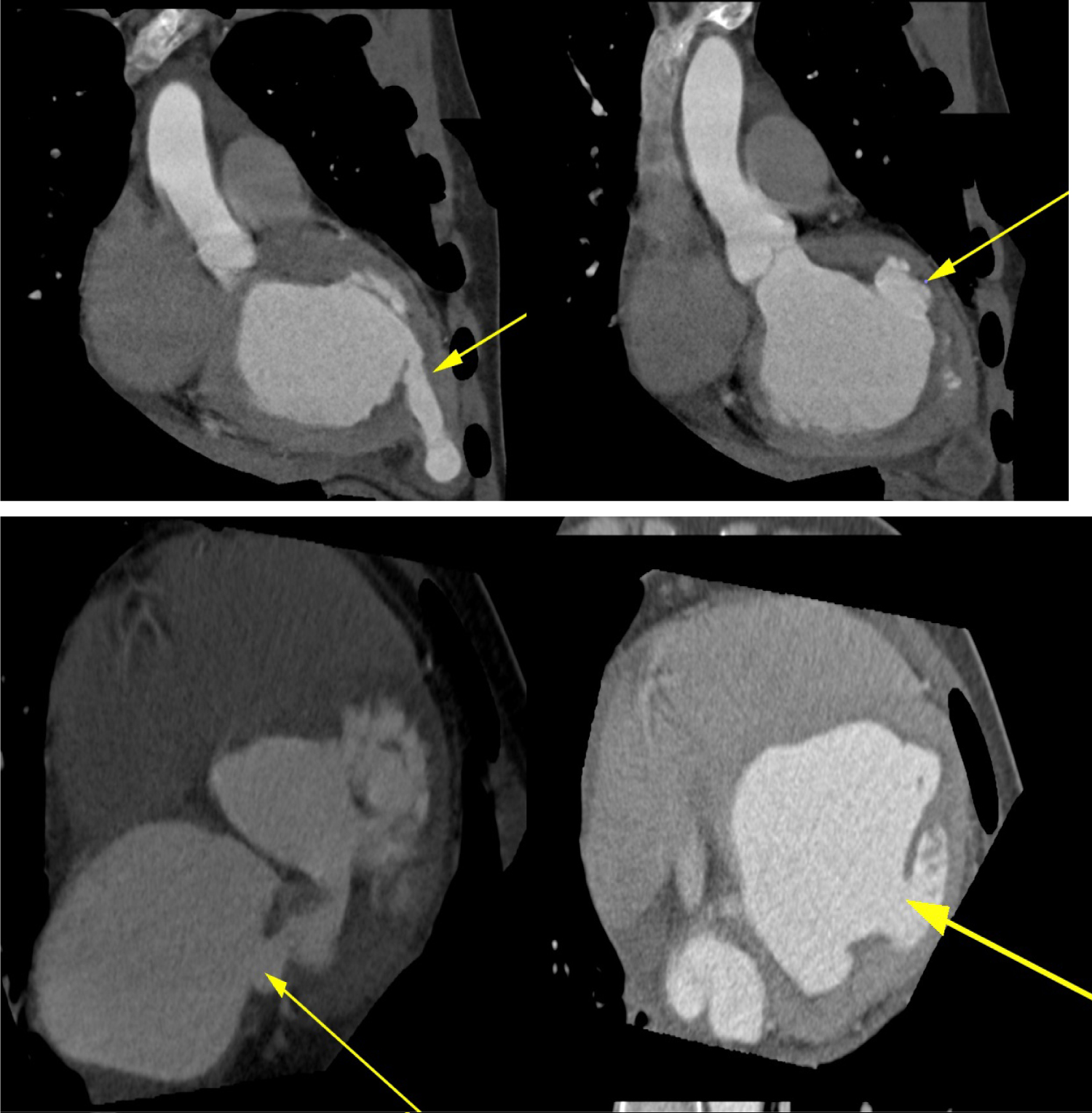 Figure 5: Multi-Detector cardiac computed Tomography showing multiple left ventricular aneurysms at the base, posterior wall, postero-lateral wall and the apex (top and bottom panels, yellow arrows) and perforation in the posterior mitral leaflet (bottom left, yellow arrow).