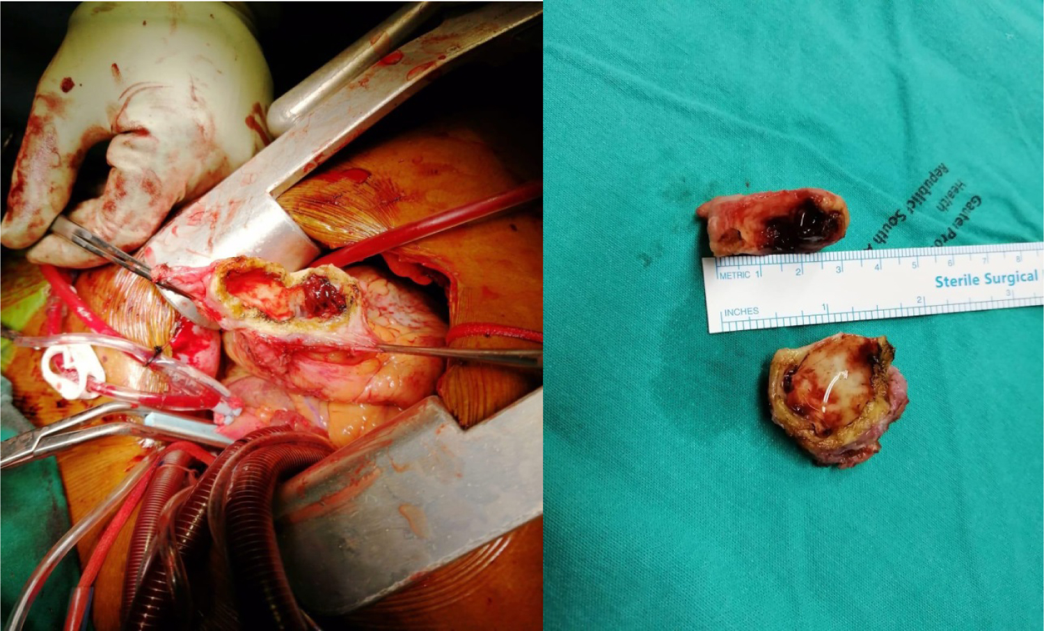 Figure 7: Intraoperative view of the apical aneurysm showing the thick walled aneurysm filled with thrombus (left and right panels).