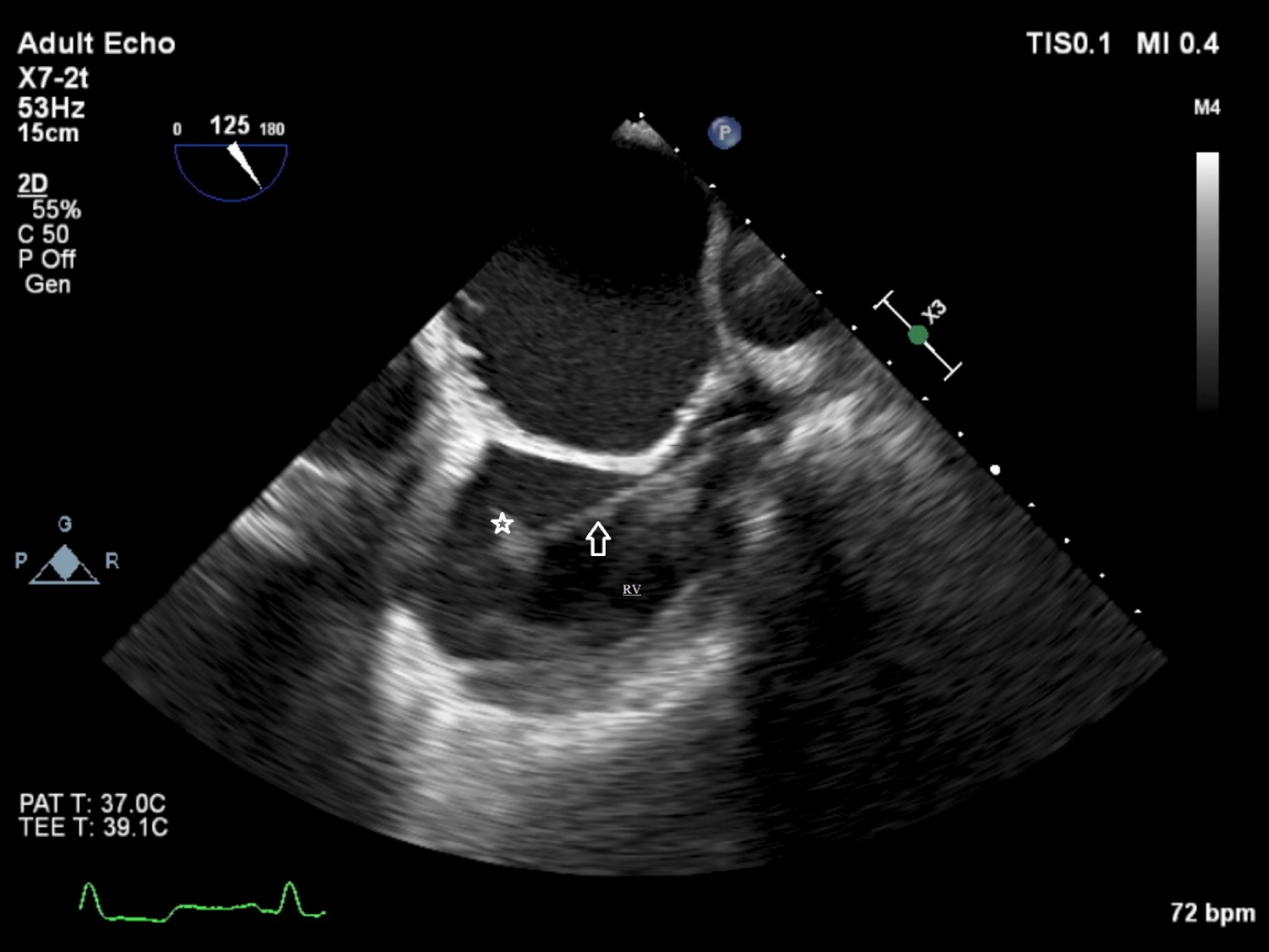 RV: Right Ventriculi; Arrow: Lead of the pace; Star: Mass (vegetation)