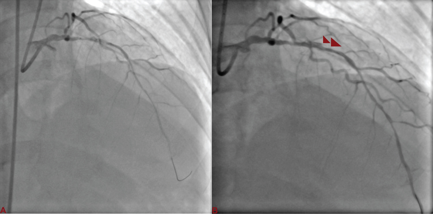 Figure 1: A) Left anterior descending artery (LAD) was wired with runthrough and sequentially dilated with 1.5 × 10 and 2 × 10 mm semicompliant balloon; B) Dissection (red arrowhead) at the distal edge following balloon dilatation. View Figure 1