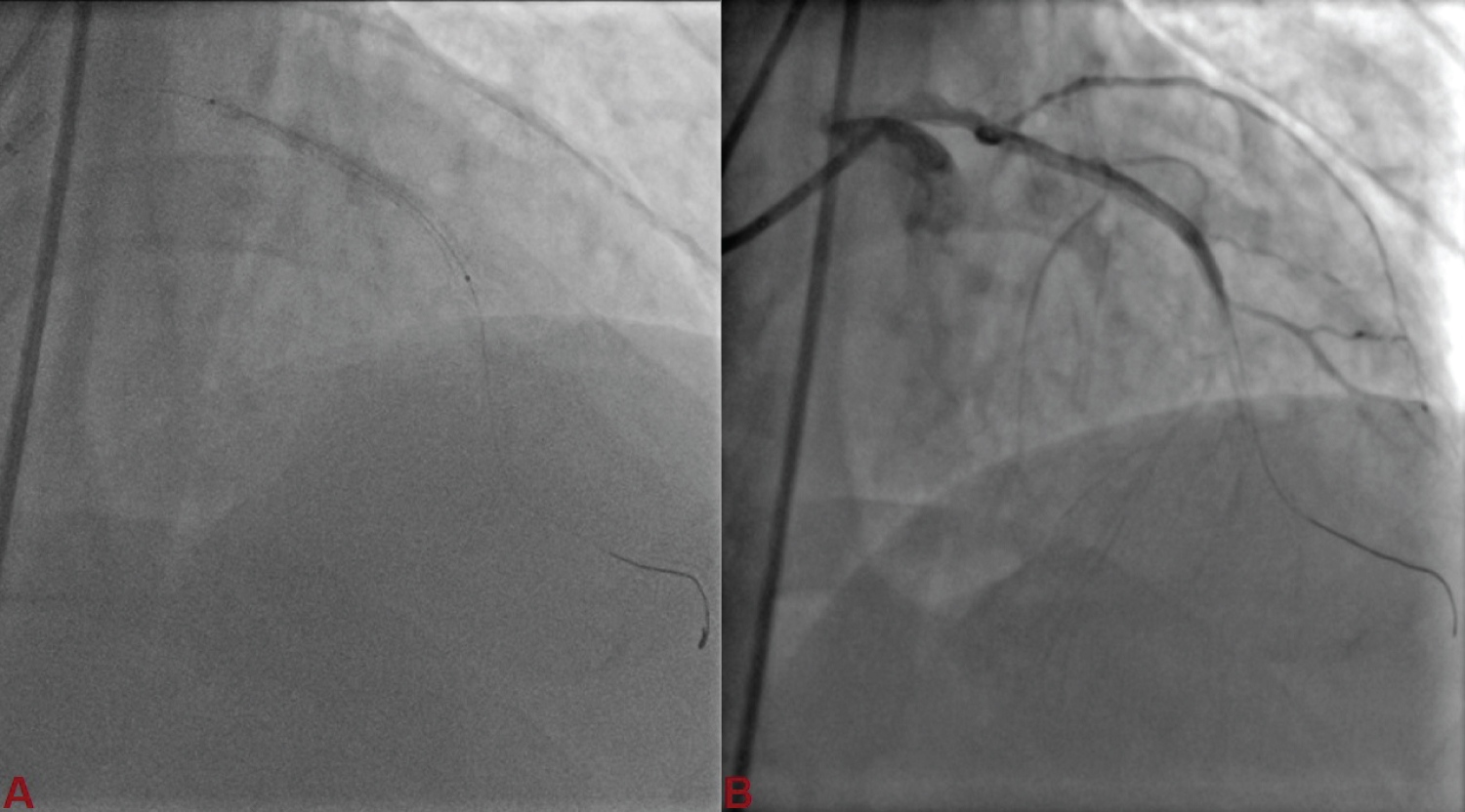 Figure 6: A) Another 2.5 × 28 mm Xience Prime stent was deployed overlapping with proximal stent; B) Both the LAD and LCx started showing TIMI III flow after stenting with complete sealing of dissection flap. View Figure 6