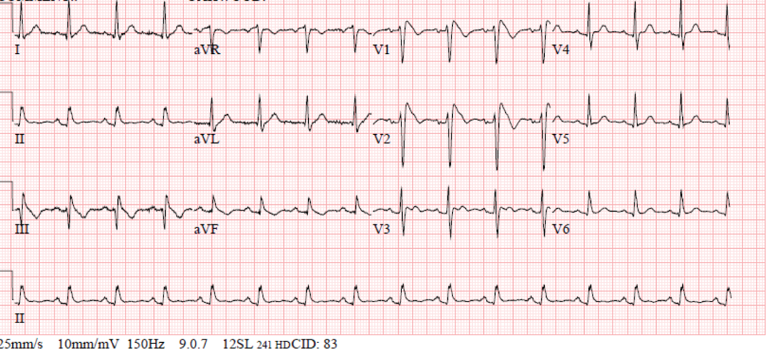 Figure 1: ECG with normal sinus rhythm and type-1 Brugada pattern.