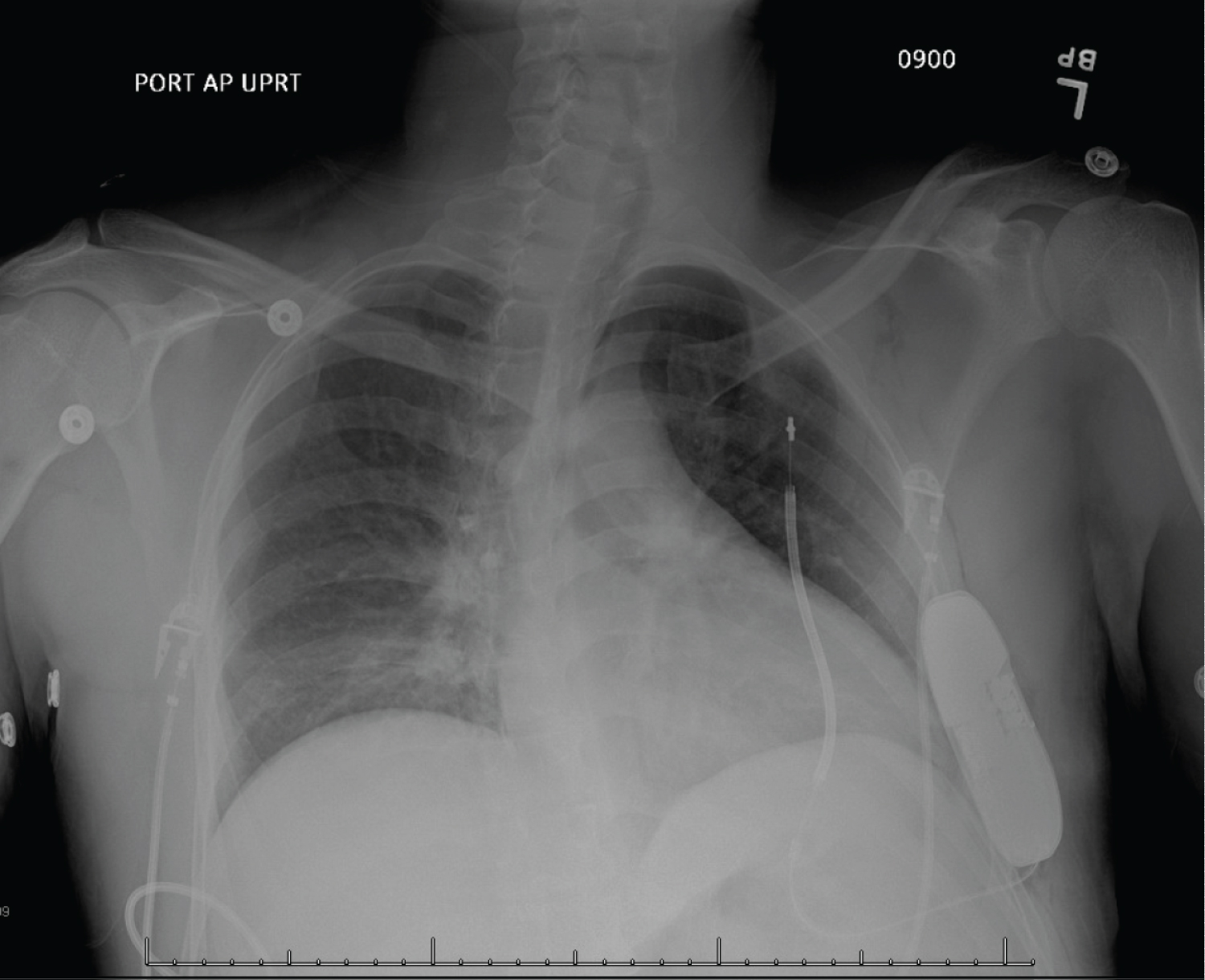 Figure 2: Chest X-ray status post subcutaneous ICD placement.