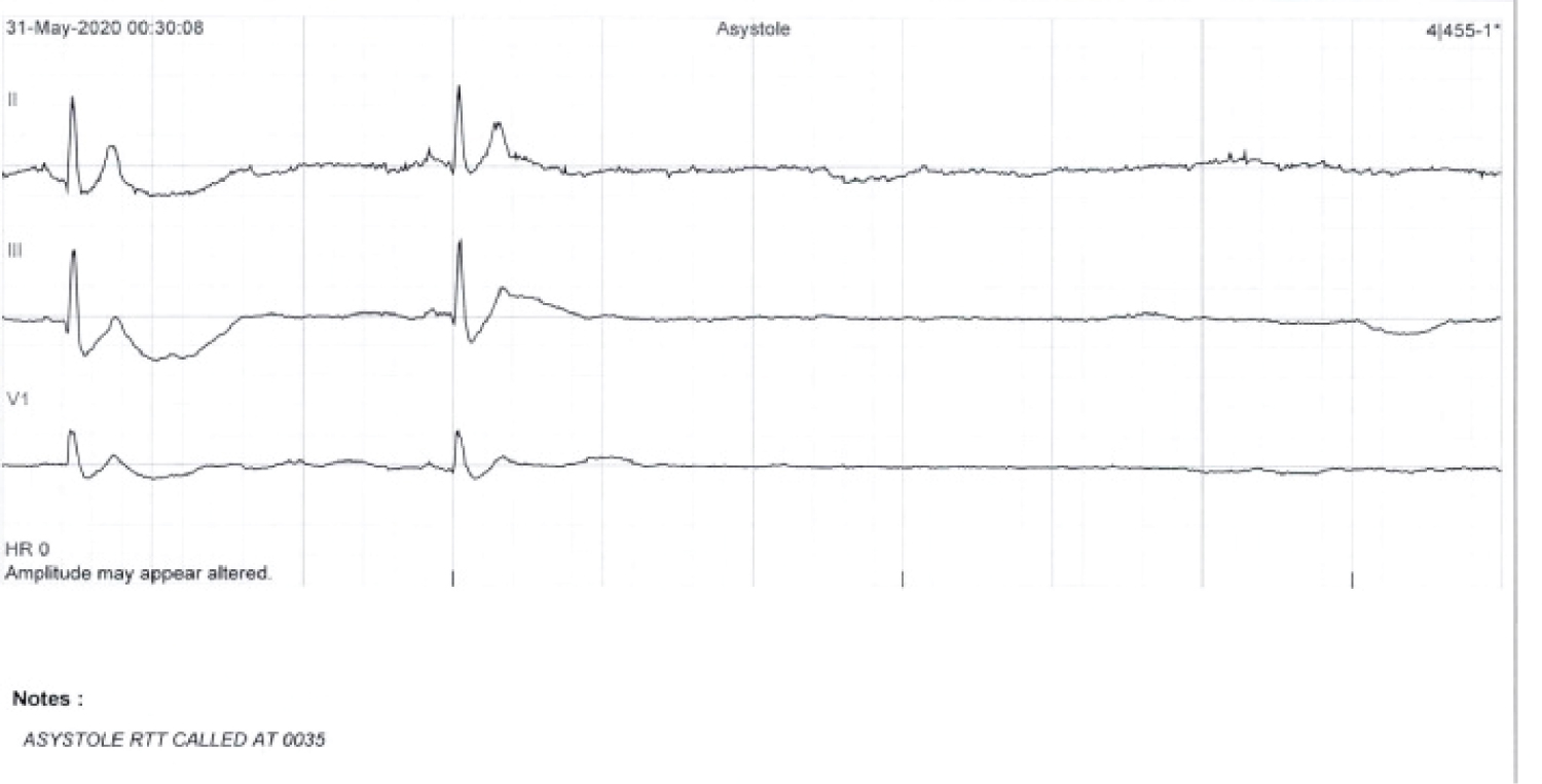 Figure 3A: In-hospital telemonitor demonstrates asystole during patient's syncopal episode.