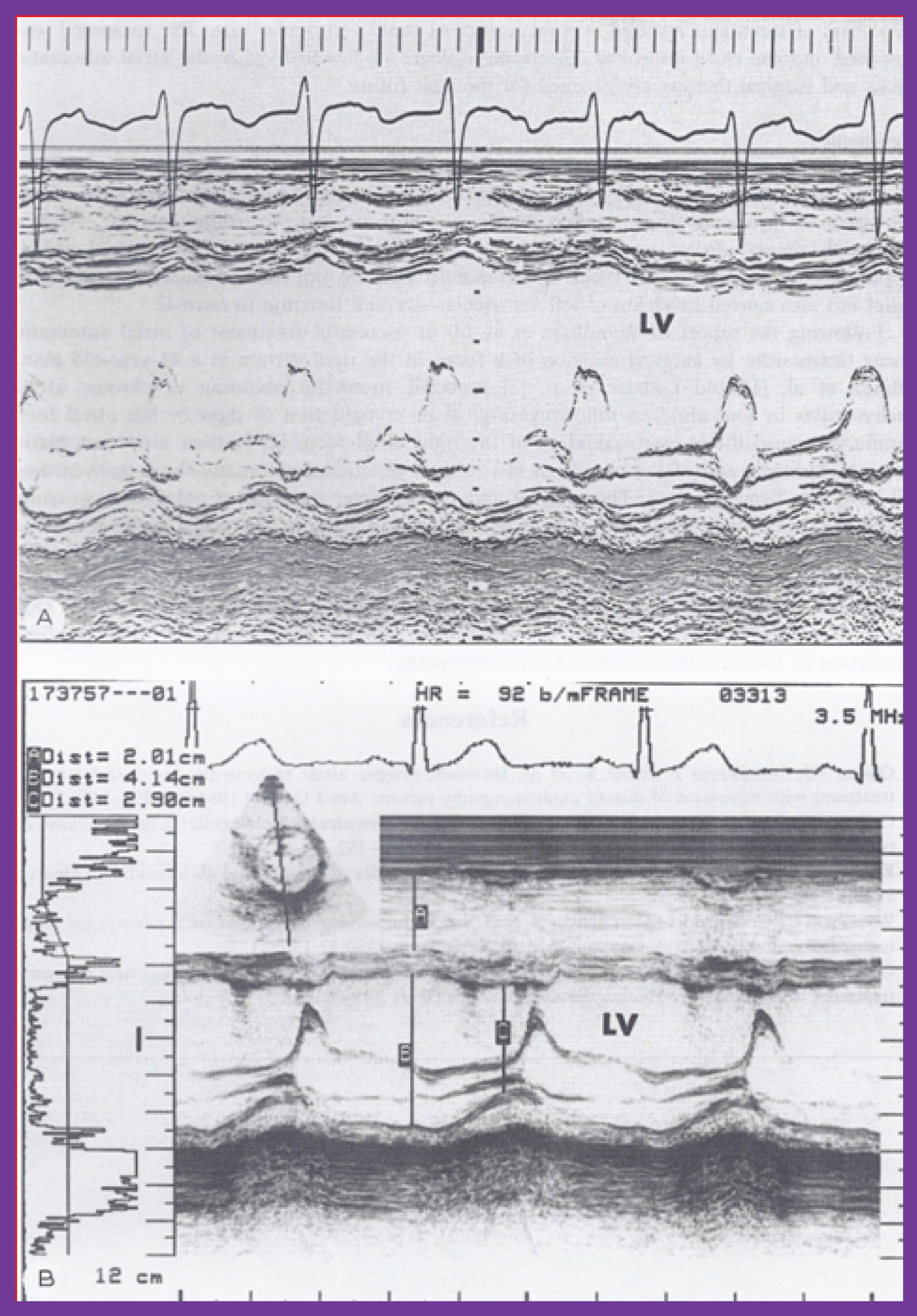 Figure 7: A) Selected M-mode recordings from the parasternal short axis view of the left ventricle (LV) made prior to and B) following hydralazine therapy. Note a significant improvement in the LV size and function [1].