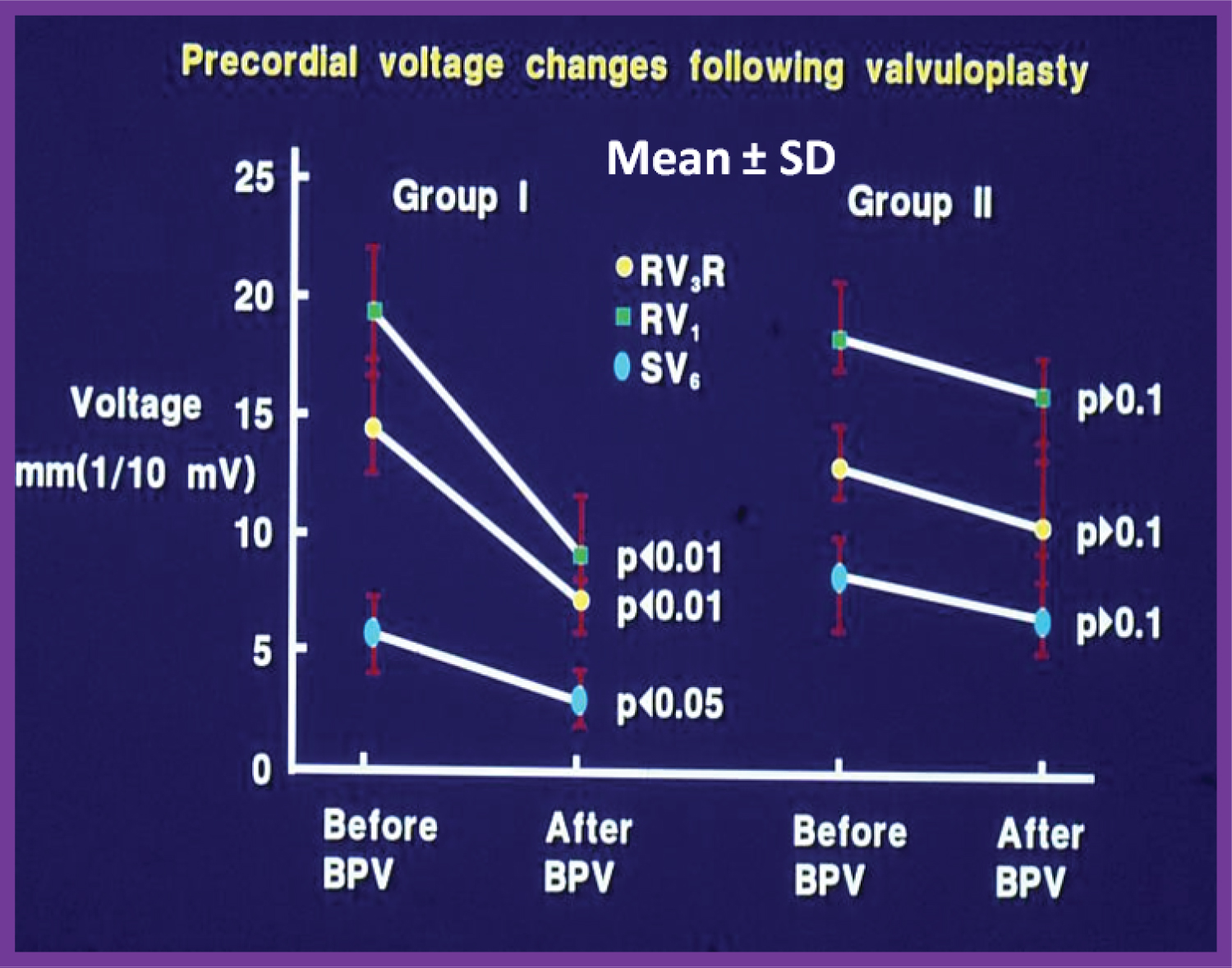 Figure 2: Precordial ECG voltages (R waves in leads V3R and V1 and S waves in V6) prior to and at follow-up after balloon pulmonary valvuloplasty (BPV) in group I (with good results) (left panel) and group II (with poor results) (right panel) are depicted. The mean and standard deviation (SD) are shown. Note the significant (p < 0.05 to 0.01) decrease in the voltages in group I while there was no significant (p > 0.1) change in group II [9].