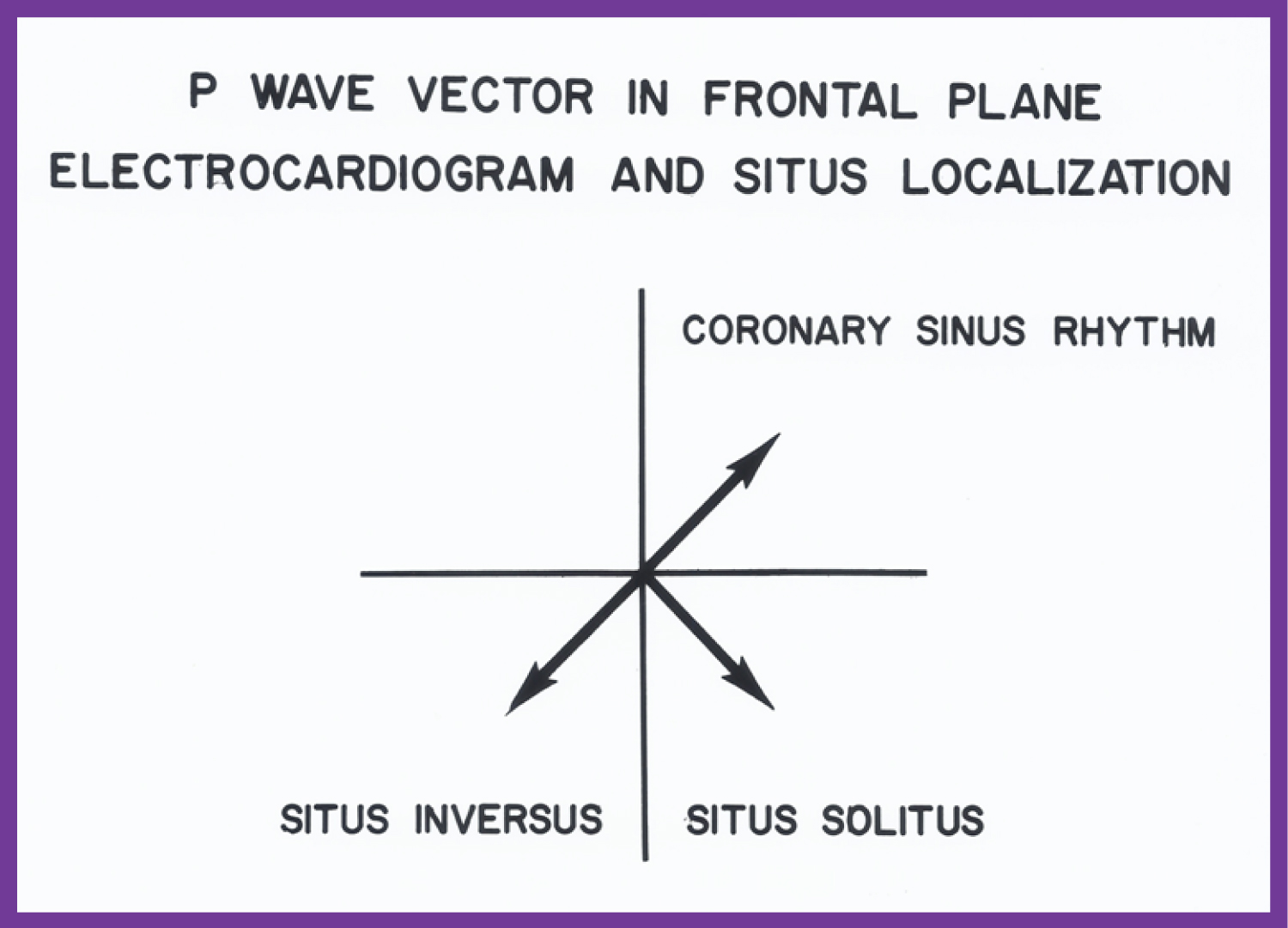 Figure 3: The location of the P vector (axis) in the frontal plane is shown for situs solitus (+45°) and situs inversus (+135°). A P vector between 0° and -90° is called coronary sinus rhythm and is not helpful in atrial situs assignment [10].