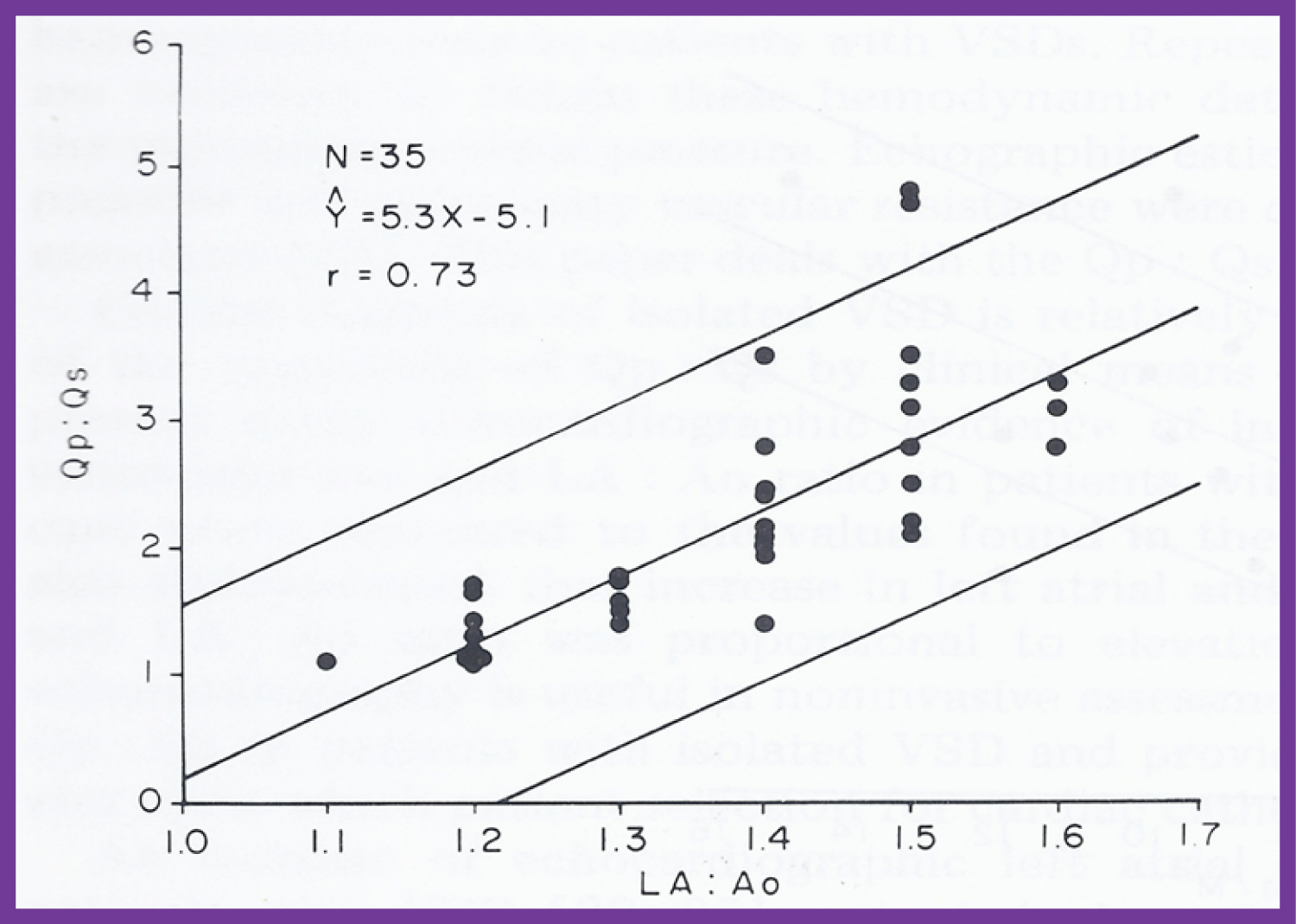 Figure 4: Scattergram demonstrating the relationship of the left atrium to aortic root ratio (LA:Ao) with the pulmonary-to-systemic flow ratio (Qp:Qs) in patients with isolated ventricular septal defects. The central line is the regression line and the parallel lines demarcate the confidence interval. The number of patients (N), regression equation and correlation coefficient (r) are shown in the insert at the top left [22].
