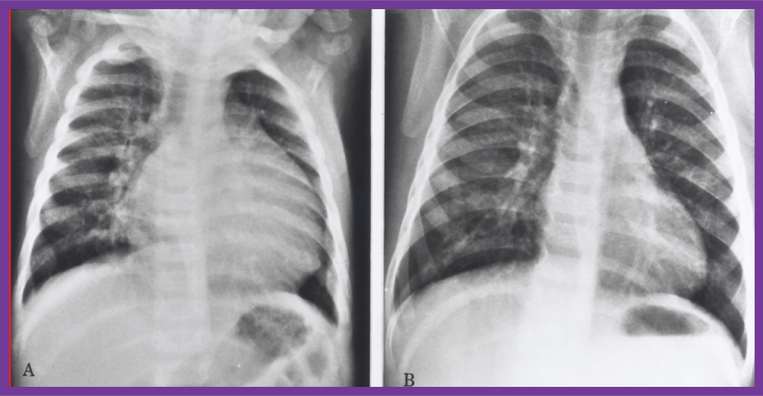 Figure 8: Chest X-rays in antero-posterior view, prior to A) and following B) Hydralazine therapy. A) Moderate cardiomegaly and pulmonary venous congestion were seen prior to therapy; B) Which improved remarkably after therapy [1].