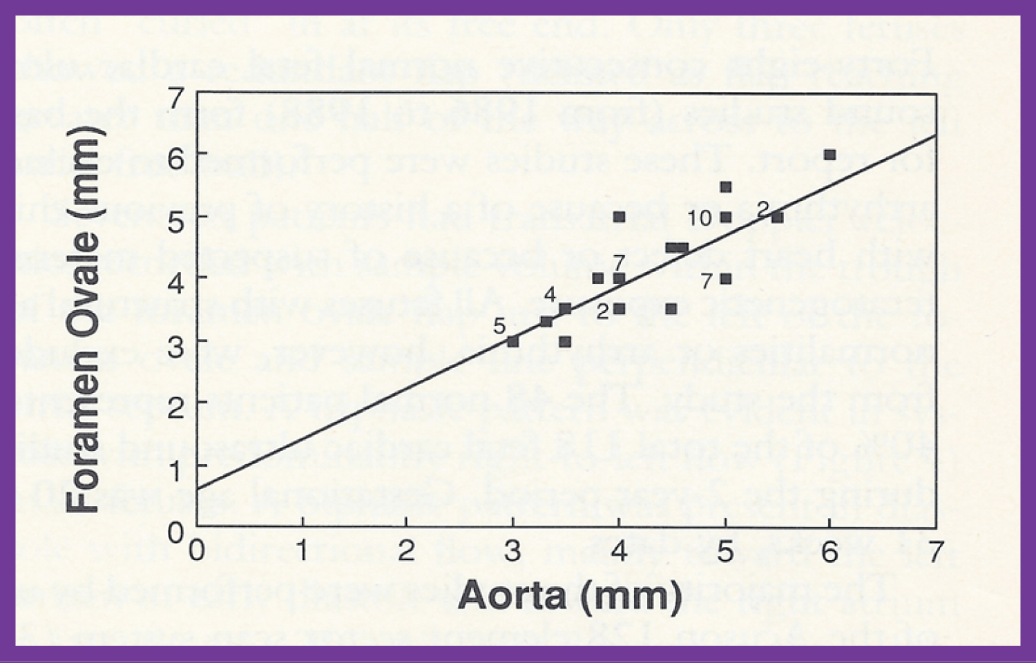 Figure 10: Plot of the diameter of the foramen ovale against the diameter of the aorta. The numbers indicate the number of subjects with that particular measurement. Note the excellent correlation with an r value of 0.84, y intercept of 0.605 and slope of 0.817 [39].